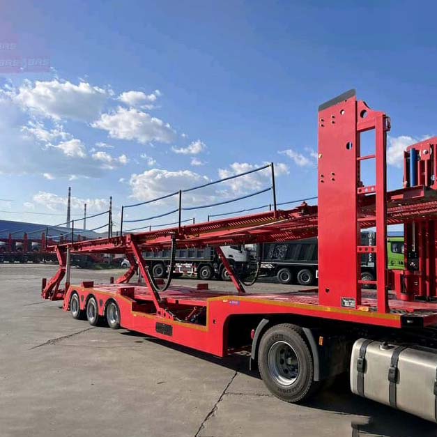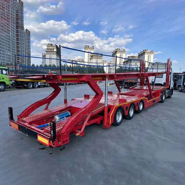 3 Aksel 8 Car Carrier Container Last Semi Trailer med sterk lastekapasitet: semitraileren er designet med optimert mekanisk struktur, den maksimale lastekapasiteten kan nå mer enn 40 tonn, noe som lett kan takle transportbehovene til forskjellige tunge biler og SUV ;med høy stabilitet: den tar i bruk avansert luftfjæringssystem, som automatisk kan justere høyden på karosseriet i henhold til veiforholdene for å sikre jevn kjøring og redusere risikoen for lastskader. I mellomtiden er den utstyrt med ABS-blokkeringsfrie bremsesystem og ESP elektronisk stabilitetsprogram for ytterligere å forbedre kjøresikkerheten; med fleksibel manøvrering: styresystemet er nøye innstilt; med energisparing og miljøvern: design med lav vindmotstand og bruk av lette materialer reduserer effektivt energiforbruket.