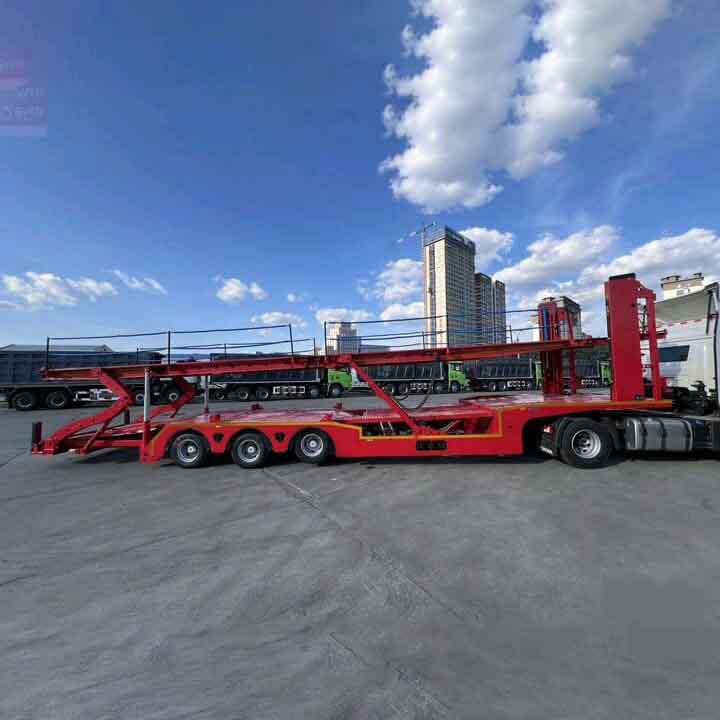 3 Aksel 8 Car Carrier Container Last Semi Trailer med intelligent overvåkingssystem: integrert GPS-posisjonering, reiseregistrering og feildiagnosefunksjoner, sanntidsovervåking av kjøretøystatus, for å sikre at transportprosessen er trygg og kontrollerbar; med justerbare armaturer: Justerbare sedan-fester leveres for forskjellige kjøretøystørrelser for å sikre at hvert kjøretøy kan støttes godt og unngå risting under transport; med lys- og varslingssystem: Foran og bak er utstyrt med LED-lysgrupper med høy lysstyrke og blinklys for å sikre kjøresikkerhet om natten eller når sikten er dårlig; med humanisert design: Det er en hvileplass på baksiden av førerhuset, utstyrt med grunnleggende oppholdsfasiliteter, noe som gir et behagelig miljø for langdistansekjøring.