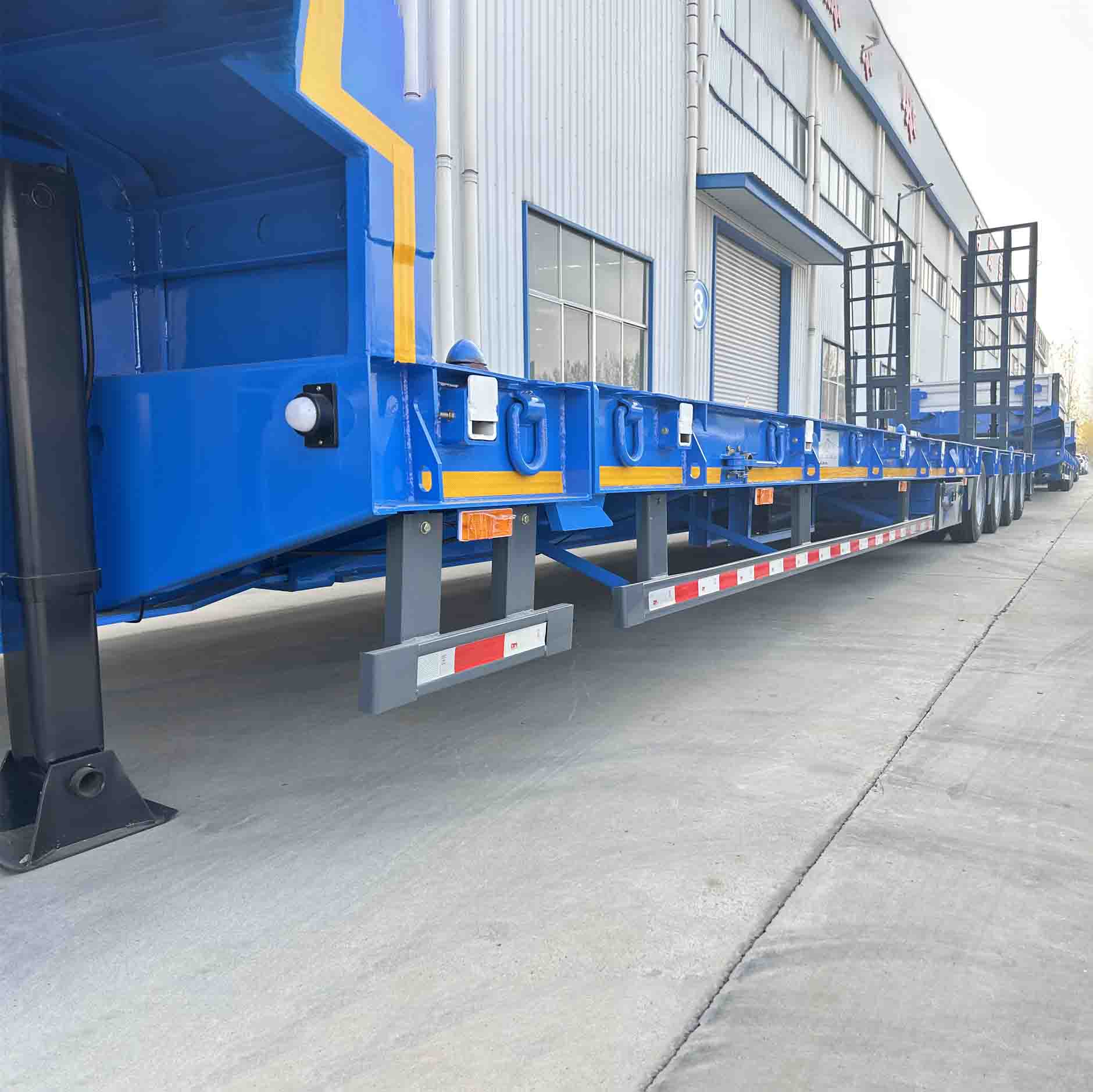 Tilpasset det russiske markedet, er derun-firaksel med lav seng med lavt seng med avanserte fjæringssystemer og styringsmekanismer for å sikre jevn håndtering i høye hastigheter og under komplekse veiforhold. Firakselutformingen forbedrer ikke bare bærekapasiteten til kjøretøyet, men optimaliserer også vektfordelingen, slik at kjøretøyet kan styre fleksibelt under tunge belastninger og lett takle smale eller svingete veier. I tillegg er denne traileren utstyrt med et meget effektivt bremsesystem for å sikre at den raskt kan stoppes i en nødsituasjon for å sikre kjøresikkerhet.