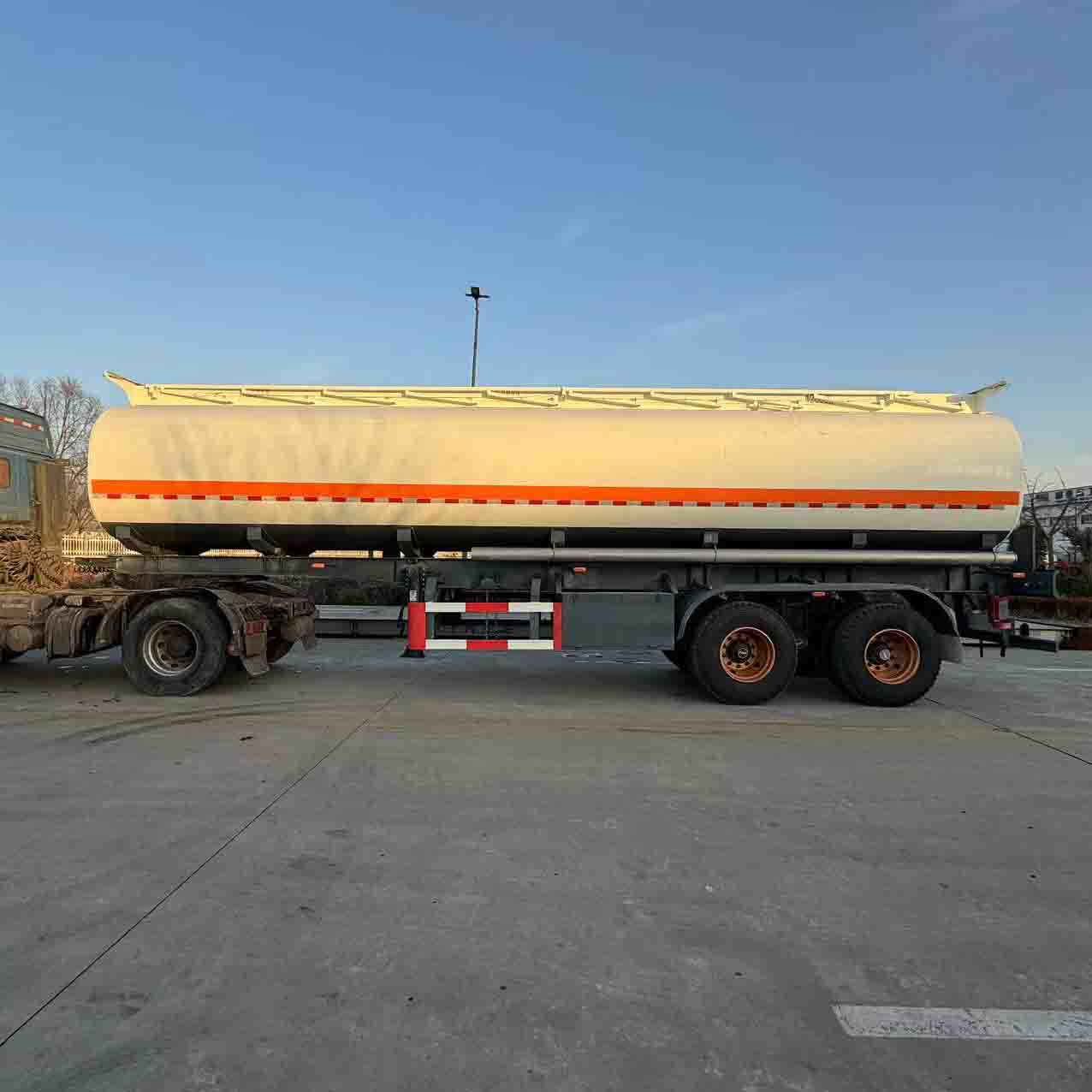 Tankskip semi-trailer med bogie-suspensjon, kroppen er laget av høy styrke-legering med presisjonssveising og antikorrosjonsbehandling for å sikre holdbarhet og korrosjonsmotstand for langvarig bruk. Tank med stor kapasitet med jevn indre vegg og ingen død plass, lett å rengjøre og forhindre flytende rester og forurensning. Unik design med ett punkt for å oppnå stabil støtte av kjøretøyet i alle retninger.