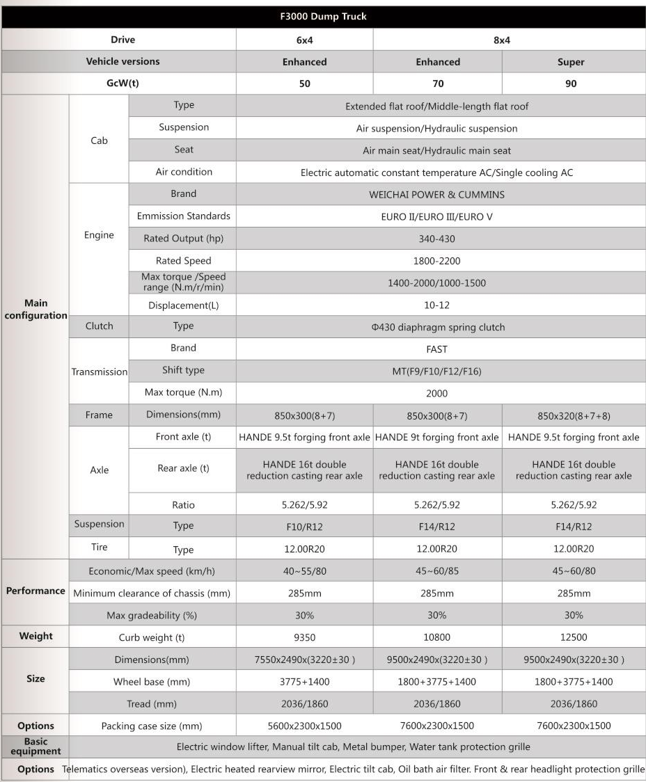 Shacman F3000 6x4 8x4 Dump Truck har høy kapasitet: Den avanserte akselen vedtar dobbelttrinns hastighetsreduksjonsaksel-teknologi og kraftig terrengkjøretøyaksel-teknologi, og har gjennomgått mer enn 1,3 millioner ganger med sterk belastningskapasitetstest uten svikt. Støplate Spring Surpersion med en ny type balansert suspensjon gir bedre belastningskapasitet og holdbarhet.